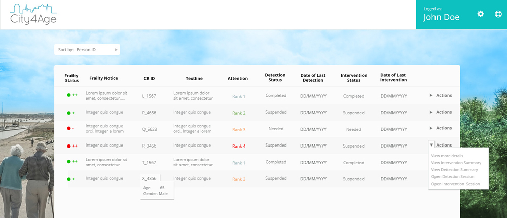 The City4Age dashboard allows to visualise the detected from the elderly end-users data into powerful graphics easily to interact with. The collaborative features of the Analytics Dashboard allows the end users (carers and practitioners) to comment, create notes and annotations.  The Dashboard allows care-givers and geriatricians to examine data about the people they treat and to detect behavioural changes that could possibly suggest a health problem or any other kind of issues. It is a web application which includes an advanced access control mechanism to prevent unauthorised users from accessing data that are of a private nature. In addition to the individual analytics the dashboard provides group analytics in order to extract valuable information of the behaviour and daily activities of the elderly end-users.