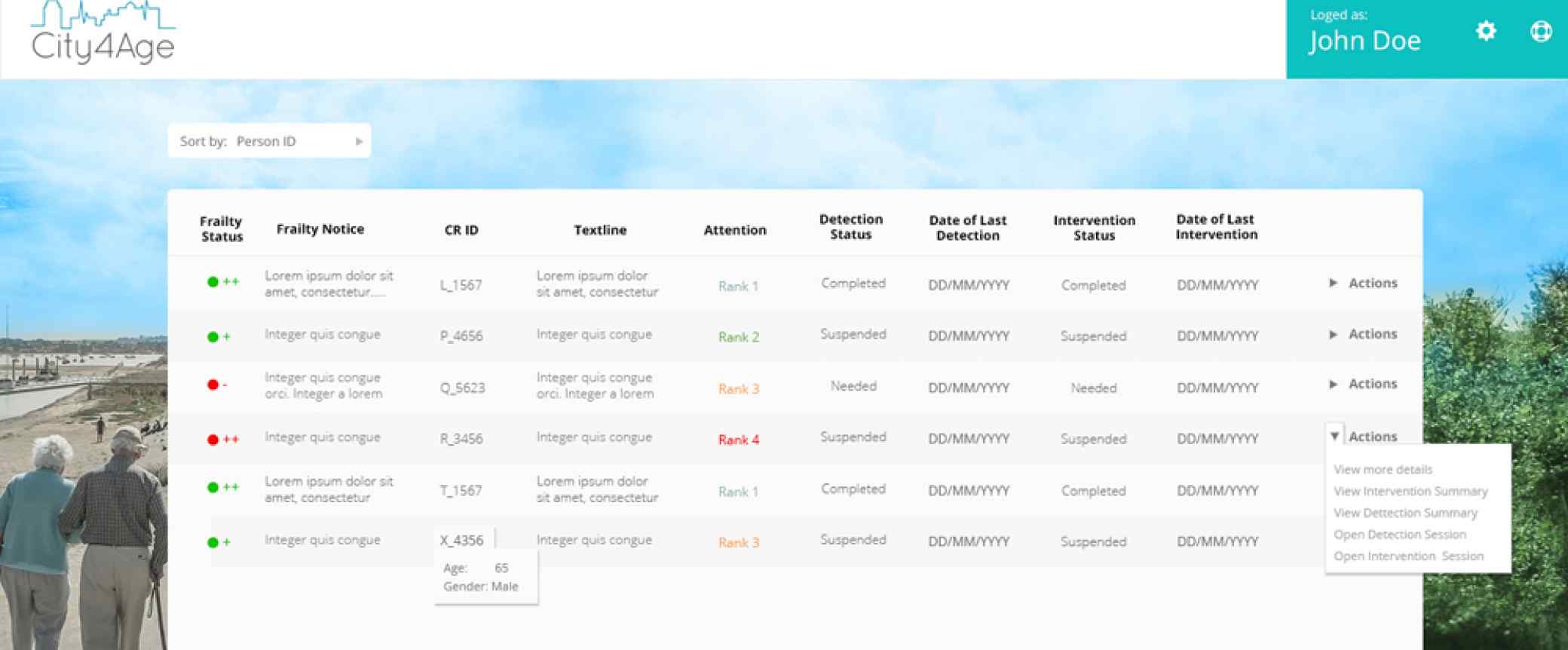 The City4Age Dashboard incorporates geriatricians’ analytics and specs in order to provide a graphical interface easy to interact with and customisable in order to facilitate the interpretation of the visualised datasets. It allows to combine different graphics and to provide an in depth analysis.